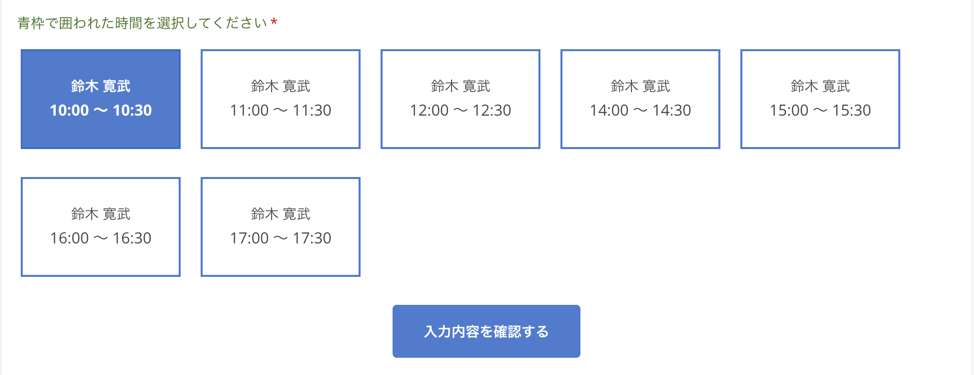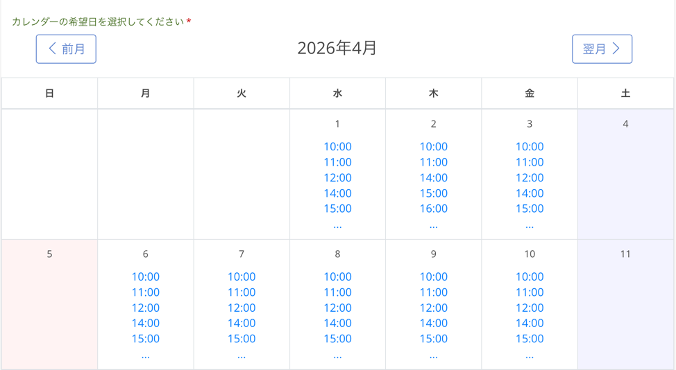カレンダー画面からサポートを受けたい日程を選び、ご希望の時間帯の枠でお申込みください。