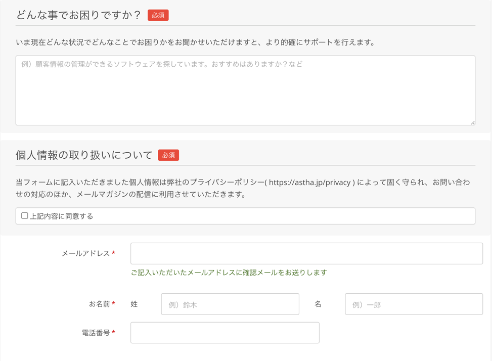 当フォームに記入いただきました個人情報は弊社のプライバシーポリシー( https://astha.jp/privacy ) によって固く守られ、お問い合わせの対応のほか、メールマガジンの配信に利用させていただきます。